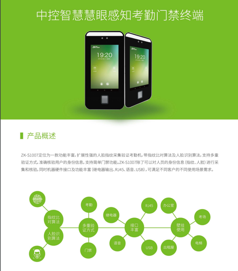 慧眼感知系列考勤門禁終端定位為功能豐富、擴展性強的面部指紋采集驗證產品,達到更好地產品體驗。ZK-S1007擁有中控智慧全新的指紋比對算法及人臉識別算法,支持多重驗證方式,準確核驗用戶的身份信息,支持簡單門禁功能,對人員的身份信息(指紋、人臉)進行采集和核驗,產品具有機器硬件接口,配備多種功能(繼電器輸出、RJ45、語音、USB、韋根輸出),可滿足不同客戶的不同使用場景需求。