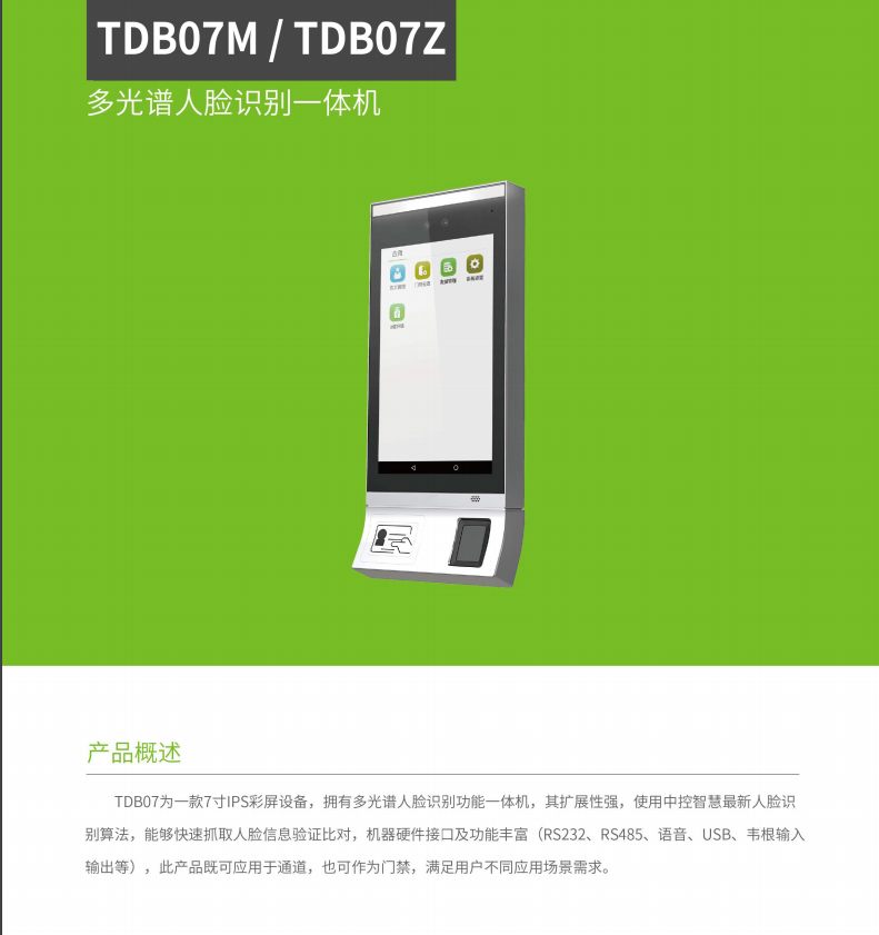 TDB07M/TDM07Z為一款7寸IPS彩屏設備,擁有多光譜人臉識別功能一體機,其擴展性強,使用中控智慧最新人臉識別算法,能夠快速抓取人臉信息驗證比對,機器硬件接口及功能豐富(RS232、RS485、語音、USB、韋根輸入輸出、輔助輸入輸出等),此產品既可應用于通道,也可作為門禁,滿足用戶不同應用場景需求。