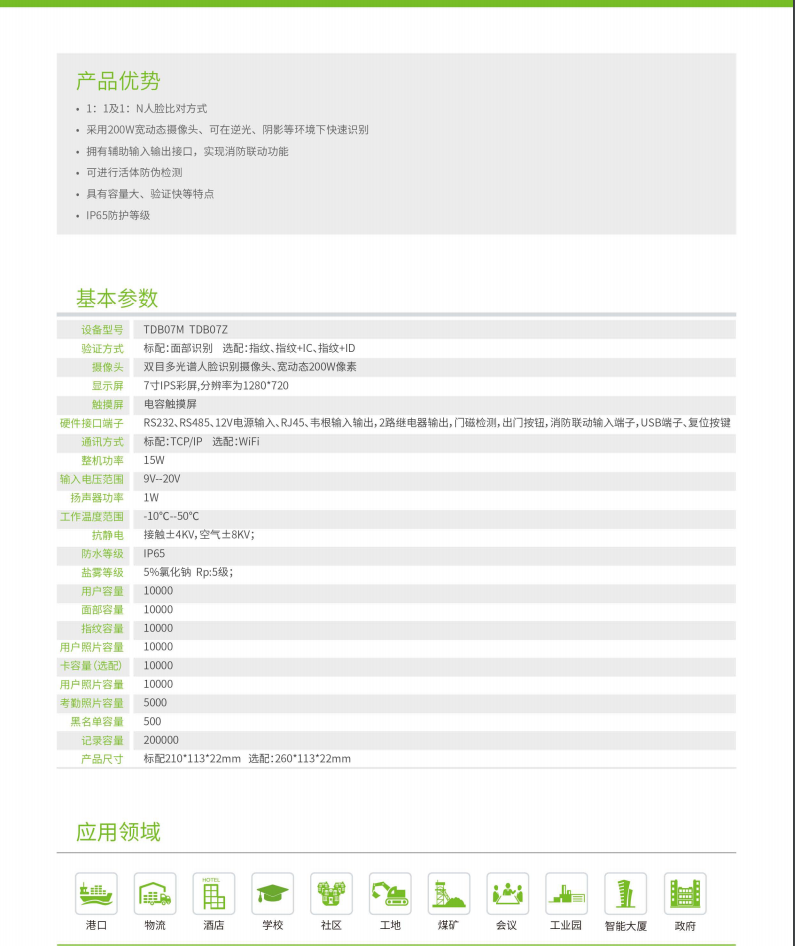 驗證方式 標配:面部識別        選配:指紋、指紋+IC、指紋+ID